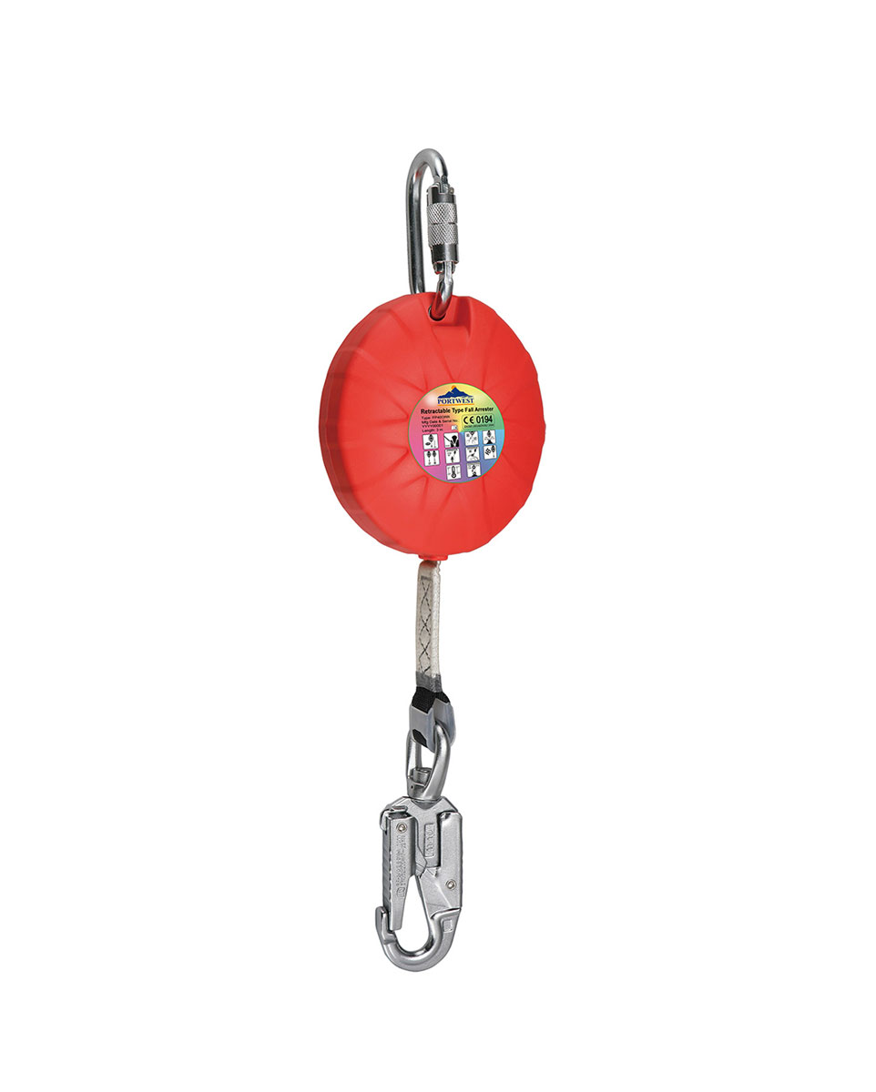 Aνάρτηση για ανακοπή πτώσης 3 μέτρων αναδιπλούμενου πλέγματος που περιλαμβάνει ένα καραμπίνερ και ένα περιστρεφόμενο άγκιστρο με διπλή κλειδαριά ασφαλείας με δείκτη φορτίου.