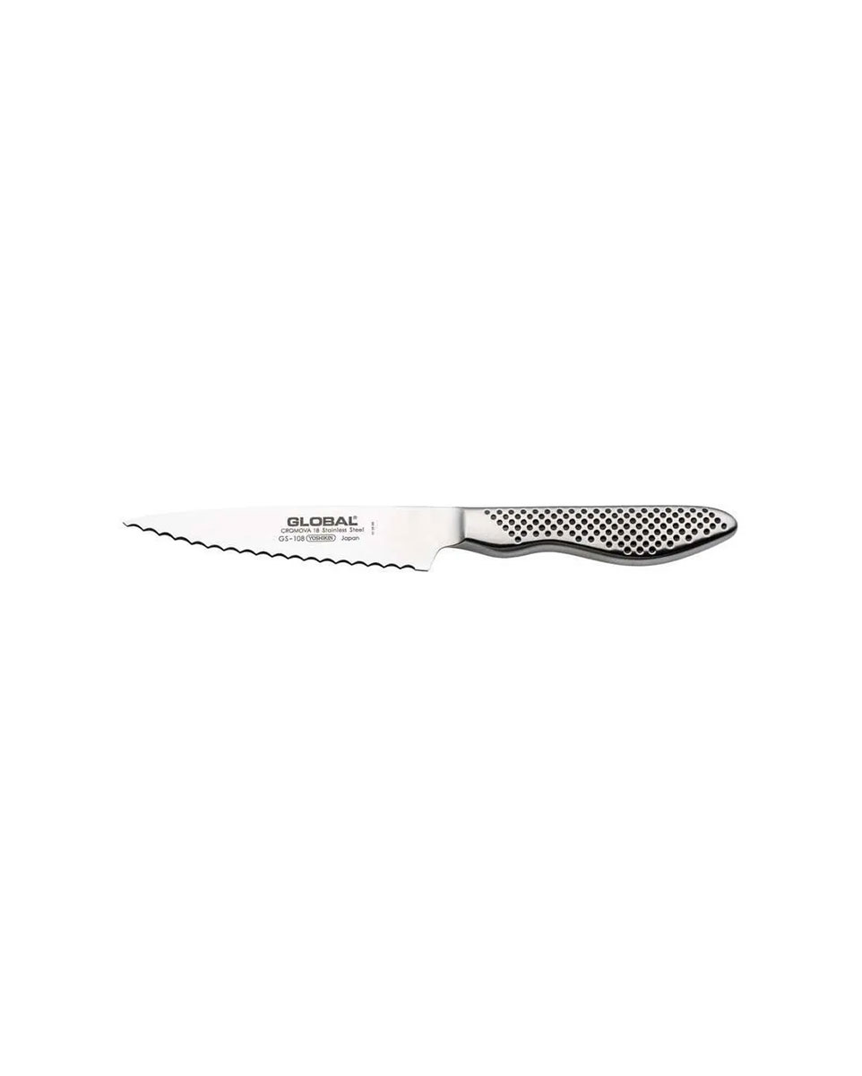 Αυτό το μαχαίρι γενικής χρήσης με χοντρές οδοντώσεις είναι το ιδανικό εργαλείο για να κόβετε εύκολα τρόφιμα με πιο παχιά κρούστα, όπως ψωμάκια ή σαλάμι, καθώς και φρούτα όπως γκρέιπφρουτ, λεμόνια και πορτοκάλια που έχουν σκληρό εξωτερικό και μαλακό κέντρο. Το μαχαίρι GS-108SC της Global είναι απόλυτα ισορροπημένο και αποτελεί εξαιρετική προσθήκη σε κάθε κουζίνα, καθώς διαθέτει τη λειτουργικότητα του μαχαιριού ψωμιού σε μικρότερη έκδοση.