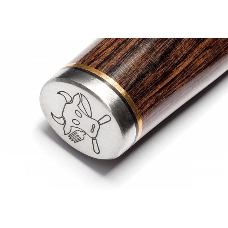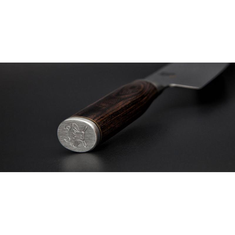 Κατασκευασμένο από δαμασκηνό ατσάλι 32 στρώσεων, που το καθιστά ανθεκτικό στη διάβρωση. Η επιφάνεια της λάμας είναι σφυρηλατημένη στο χέρι, δίνοντας με αυτό τον τρόπο μια διαχρονική αισθητική ποιότητα.