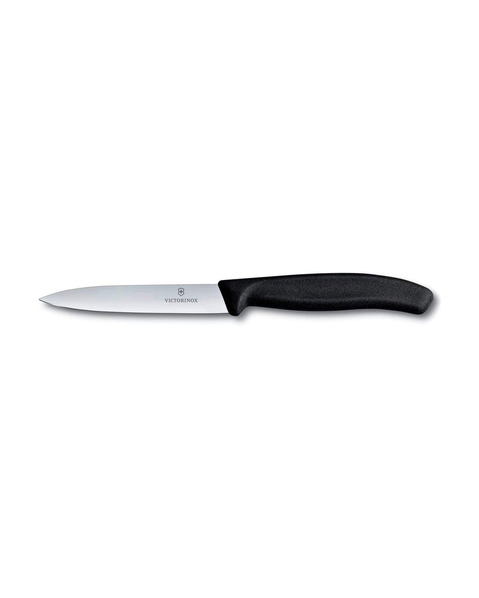 Αποκτήστε μυτερό το μαχαίρι κουζίνας 10 εκ. με μαύρη λαβή Swiss Classic της Victorinox και απολαύστε την ανοξείδωτη λάμα, την εργονομική λαβή και την ελβετική κατασκευή του. Πλένεται εύκολα στο πλυντήριο πιάτων!