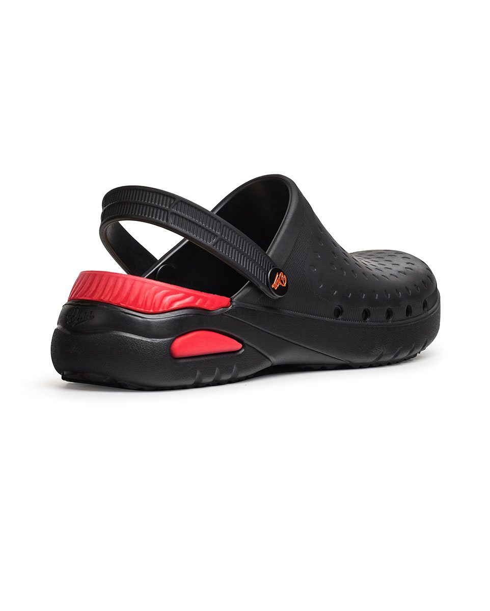 Διαθέτει πτυσσόμενο πίσω ιμάντα, με οπές στα πλάγια για να διευκολύνεται η εφίδρωση, ο καθαρισμός και να αποφεύγεται η άμεση διείσδυση υγρών στο παπούτσι.